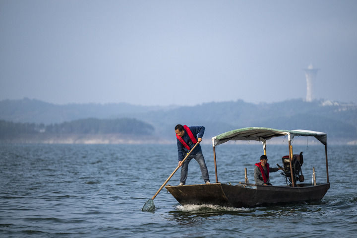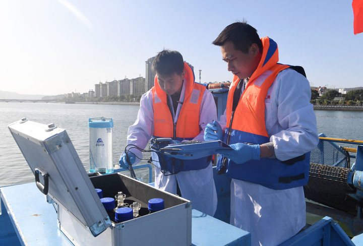 在丹江口库区河南淅川县鹳河流域城区段,南阳市生态环境局淅川分局工作人员记录采样水体质量情况(2024年11月28日摄)。新华社记者 郝源 摄