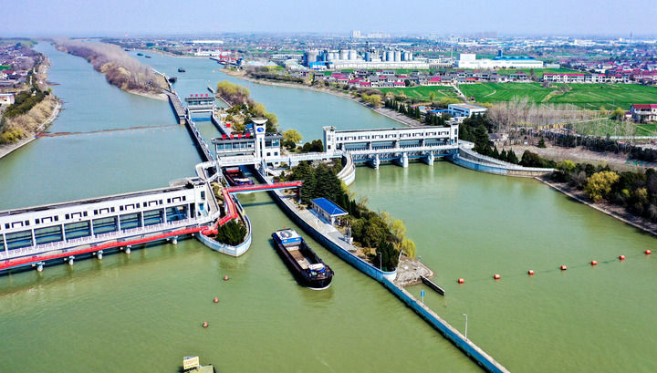 位于江苏省扬州市江都区的南水北调东线一期工程运盐闸、邵仙套闸、邵仙闸洞(2024年3月19日摄,无人机照片)。新华社发(任飞摄)