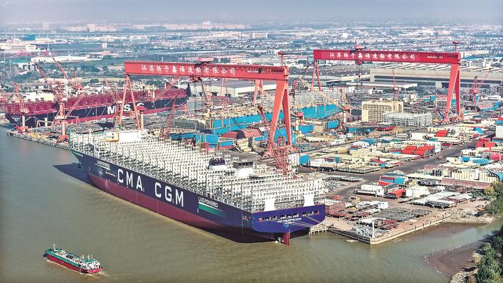 新时代造船交给的国内首艘甲醇双燃料9000TEU集装箱船,标志着泰州市在清洁动力船型范畴完成打破;扬子鑫福为法国达飞海运集团承建的首制24000TEU双燃料动力集装箱船,是全球最先进的绿色船只之一,与传统燃油集装箱船比较,二氧化碳排放量削减约20%,硫氧化物和颗粒物排放量削减99%。新时代造船建成国内最大单体智能化分段车间(480米长),提高平面分段功率30%,将巴拿马型散货船制作周期从2年缩短至8个月。